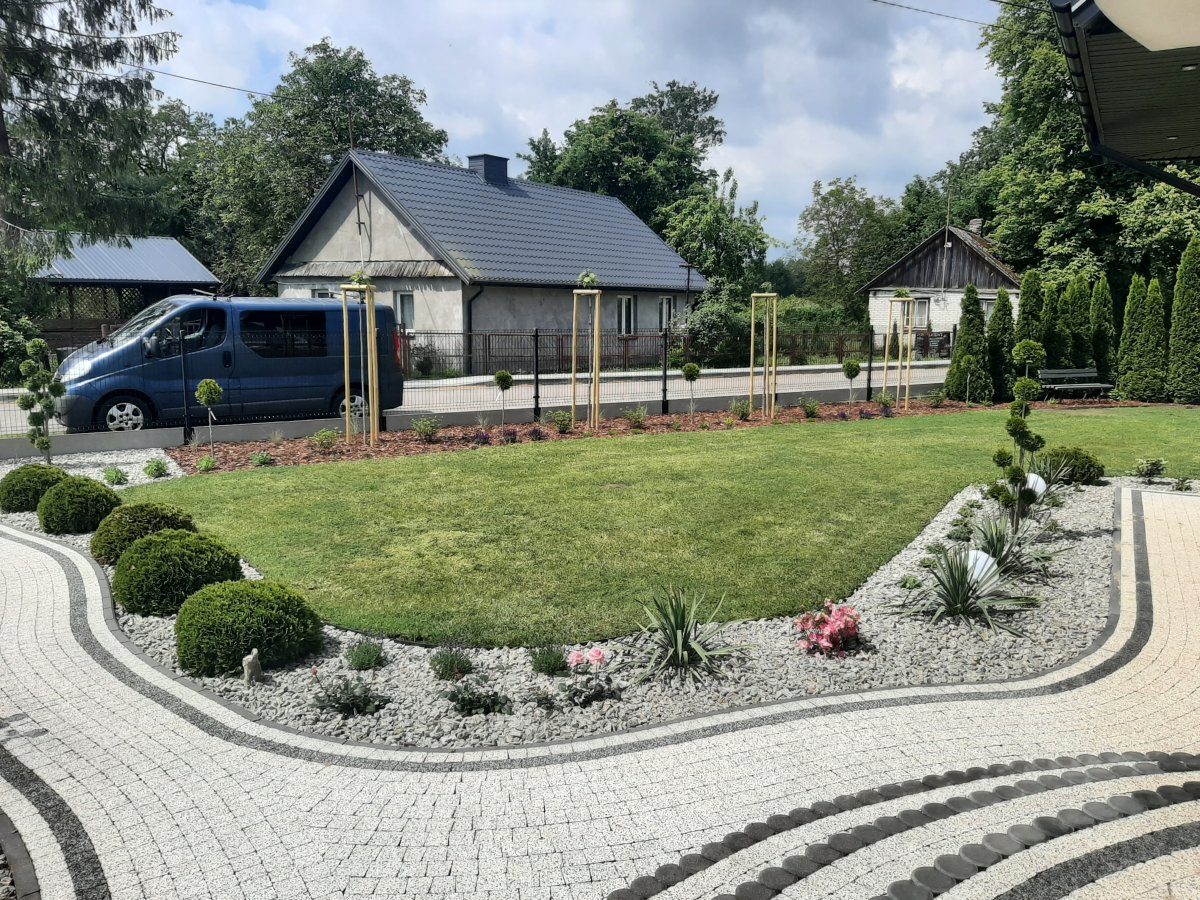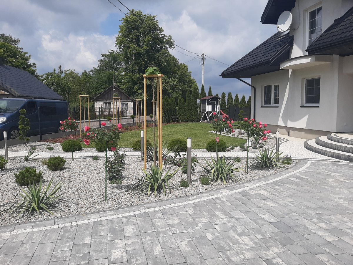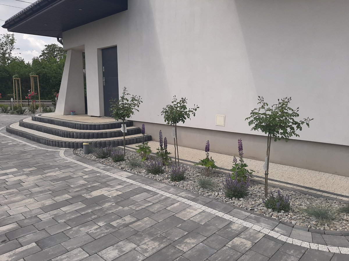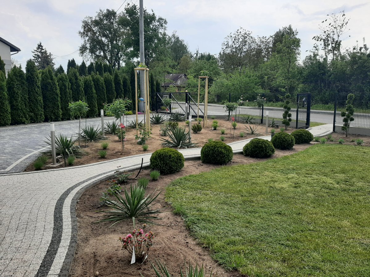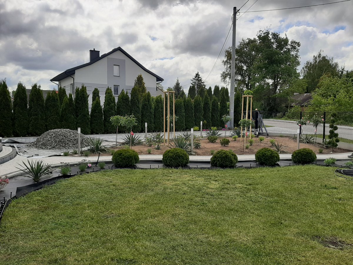 Reprezentacyjna część frontowa, pełna kwitnących roślin. Wśród życzeń Inwestora znalazły się katalpy, hortensje, róże, trawy ozdobne, a także formowane na wzór "bonsai" iglaki. Termin realizacji maj.