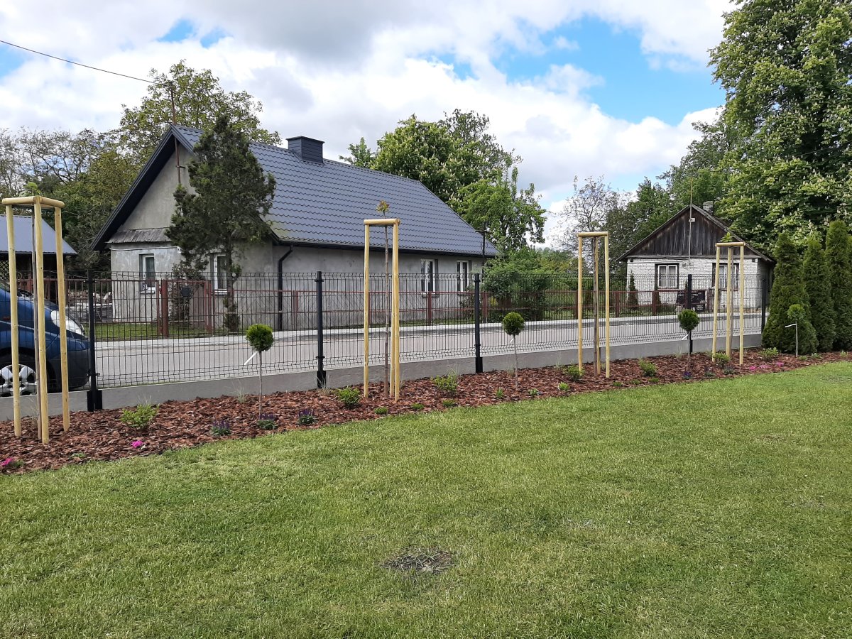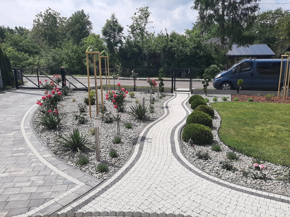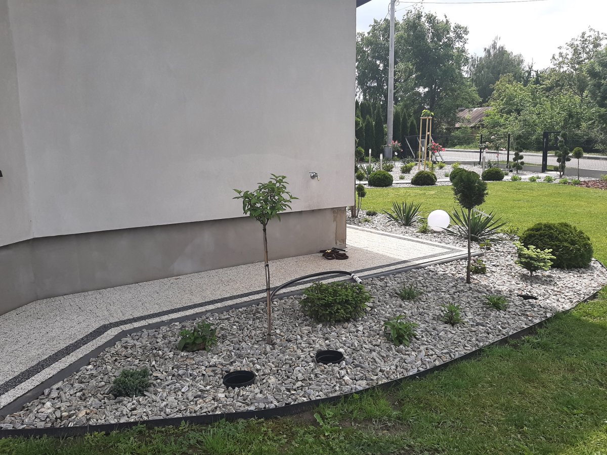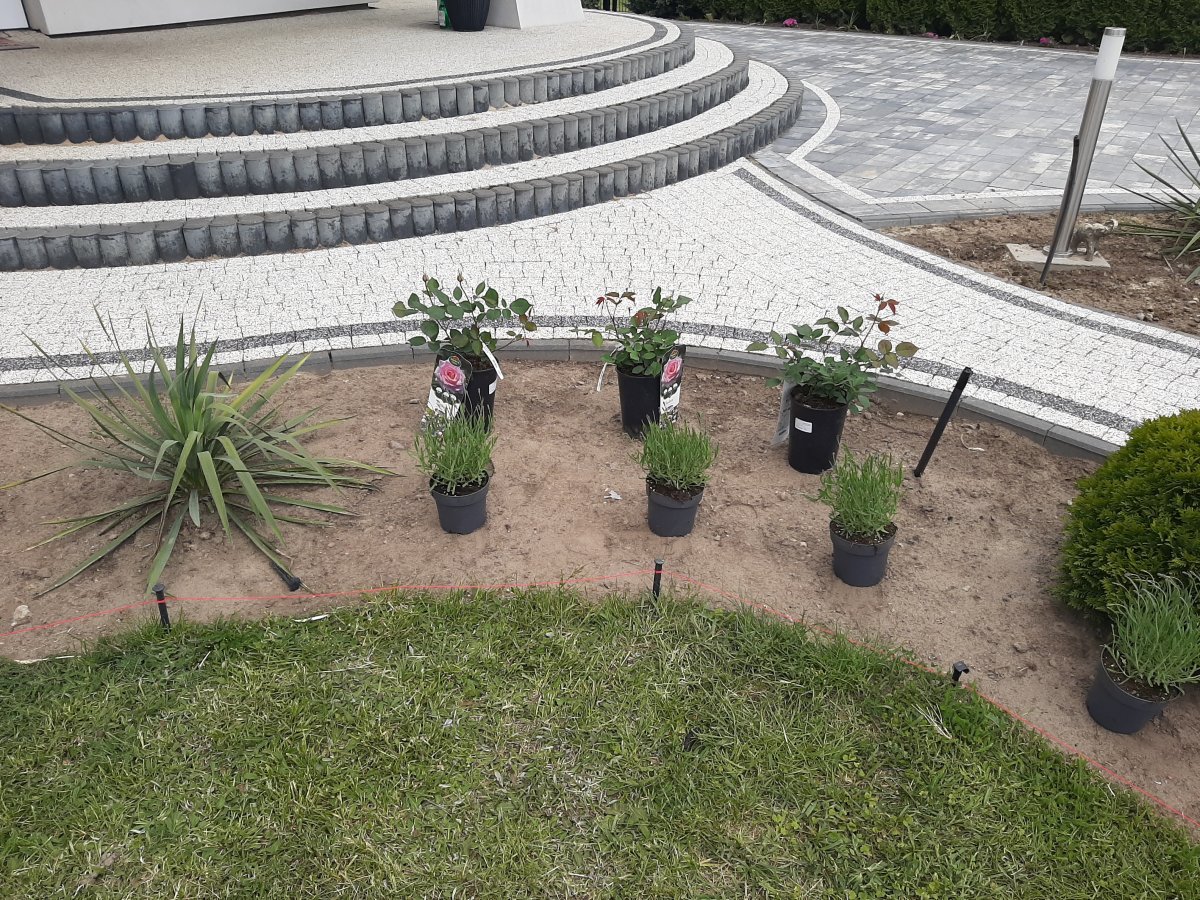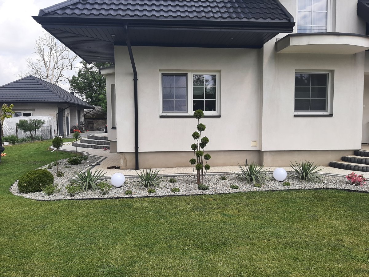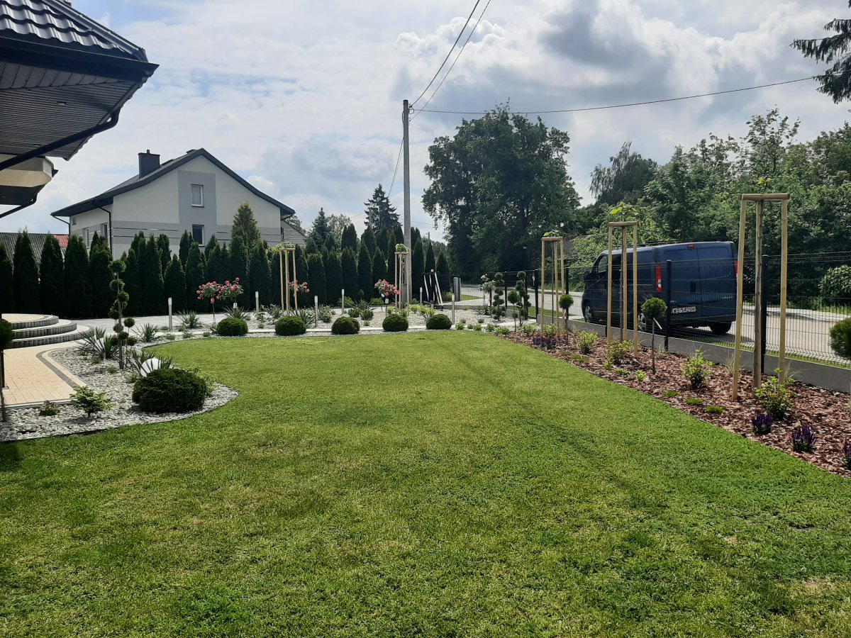 Reprezentacyjna część frontowa, pełna kwitnących roślin. Wśród życzeń Inwestora znalazły się katalpy, hortensje, róże, trawy ozdobne, a także formowane na wzór "bonsai" iglaki. Termin realizacji maj.