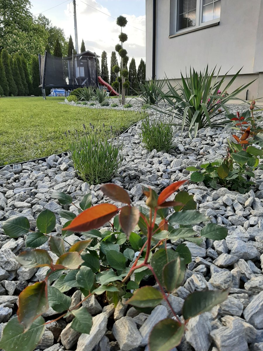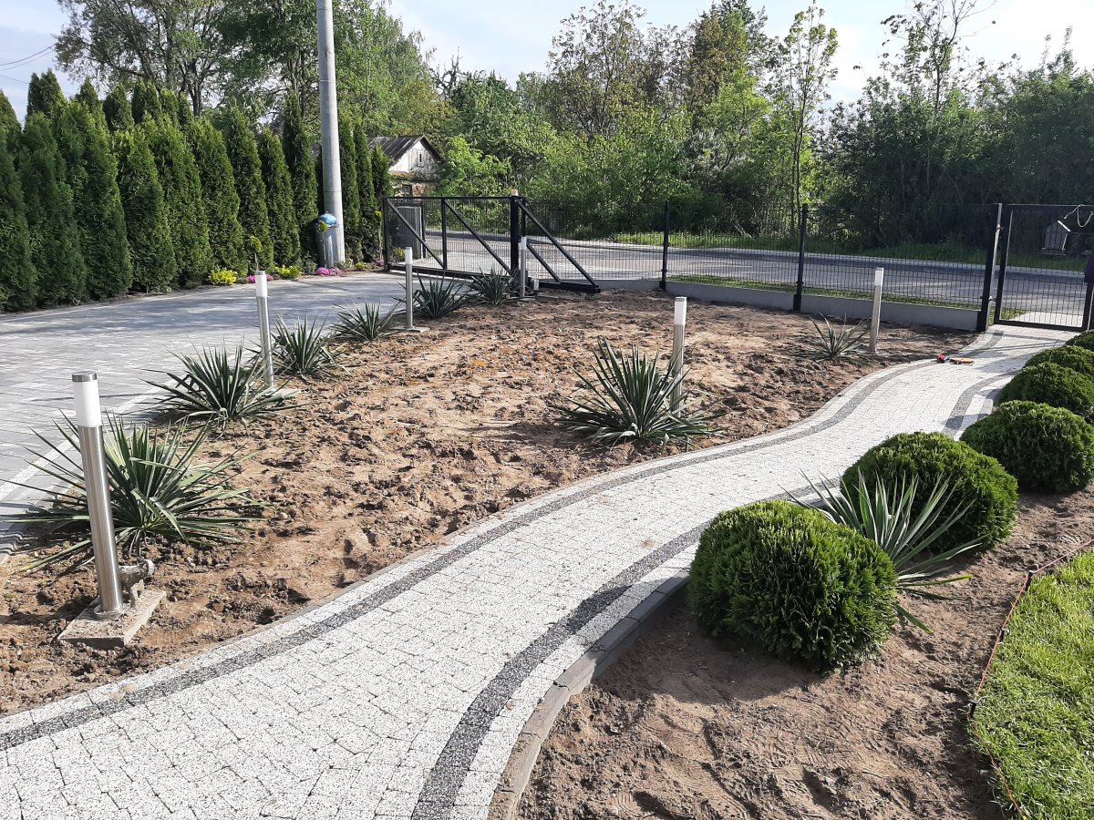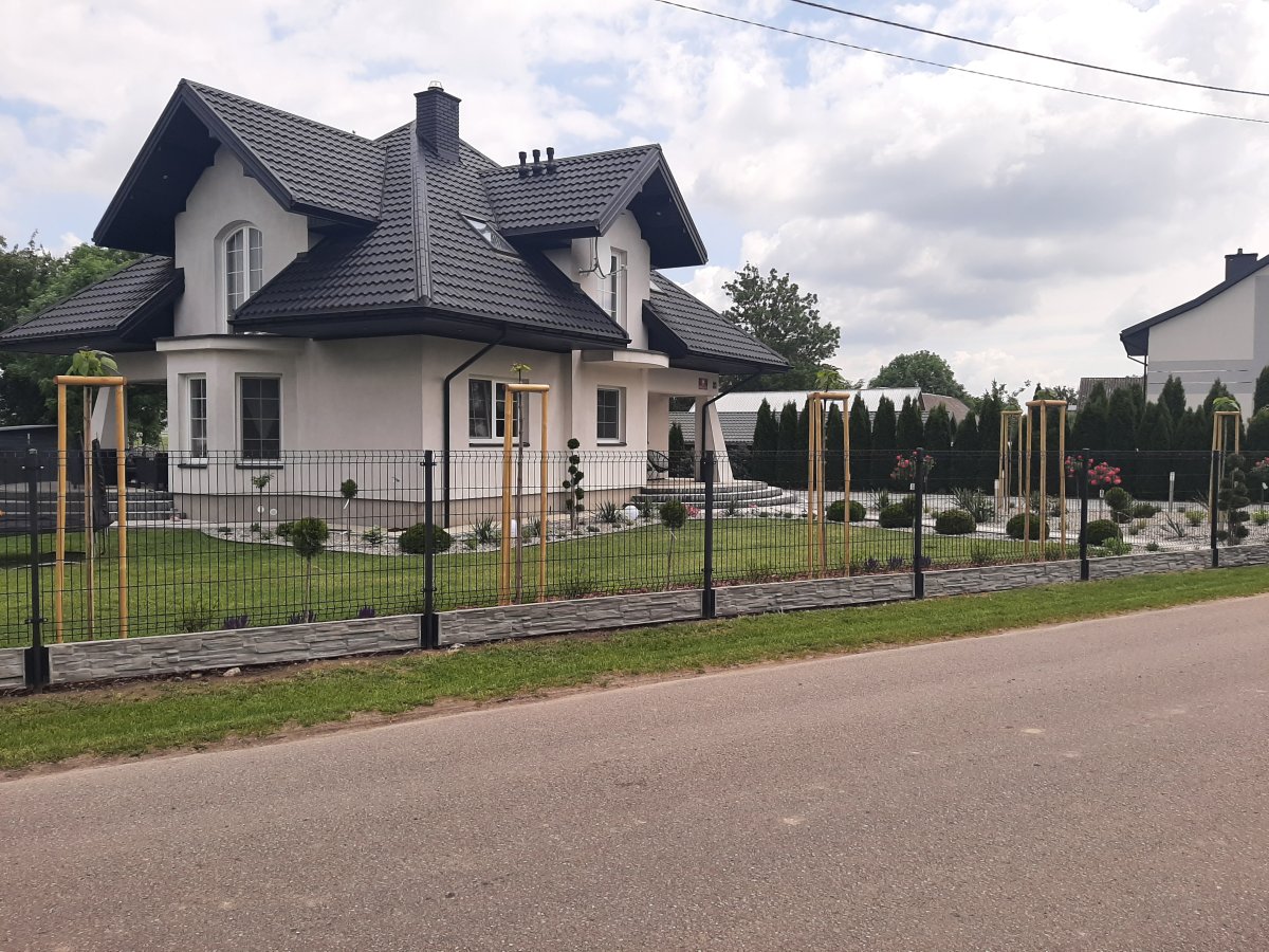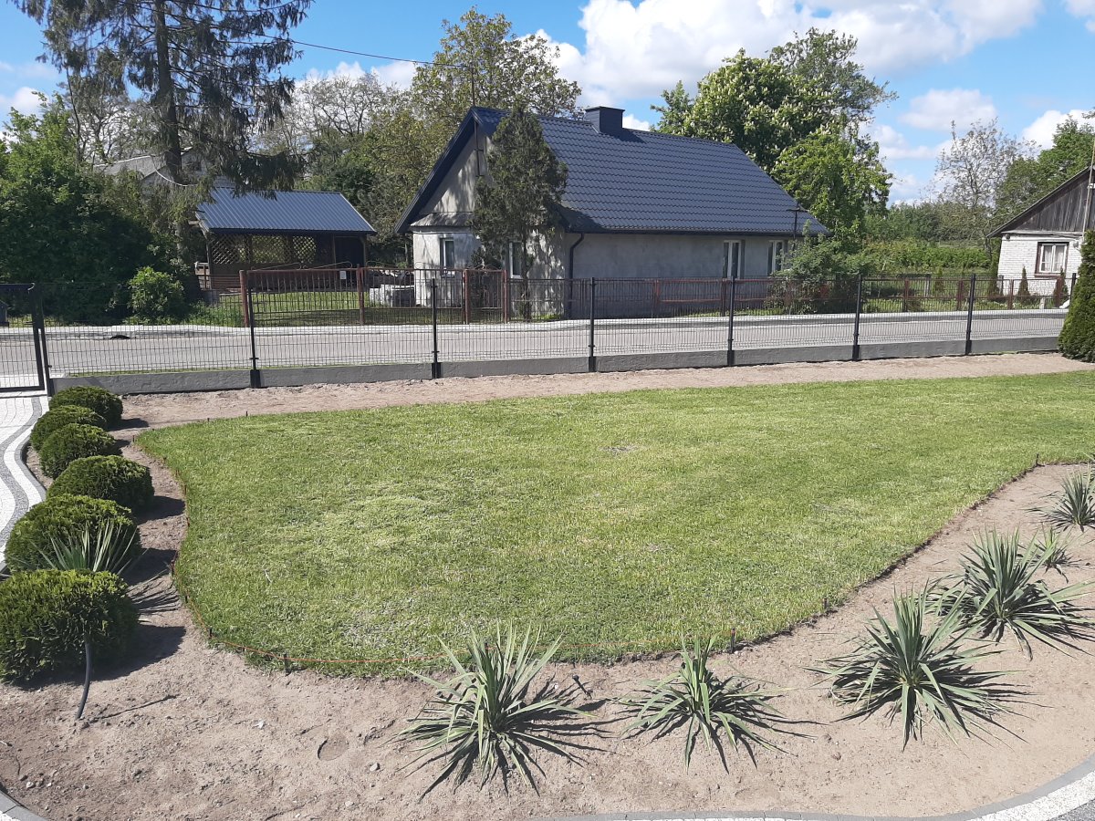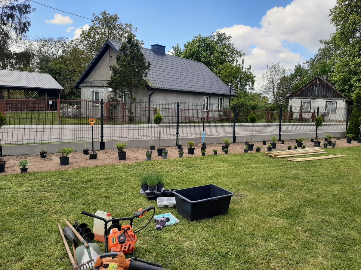 Reprezentacyjna część frontowa, pełna kwitnących roślin. Wśród życzeń Inwestora znalazły się katalpy, hortensje, róże, trawy ozdobne, a także formowane na wzór "bonsai" iglaki. Termin realizacji maj.