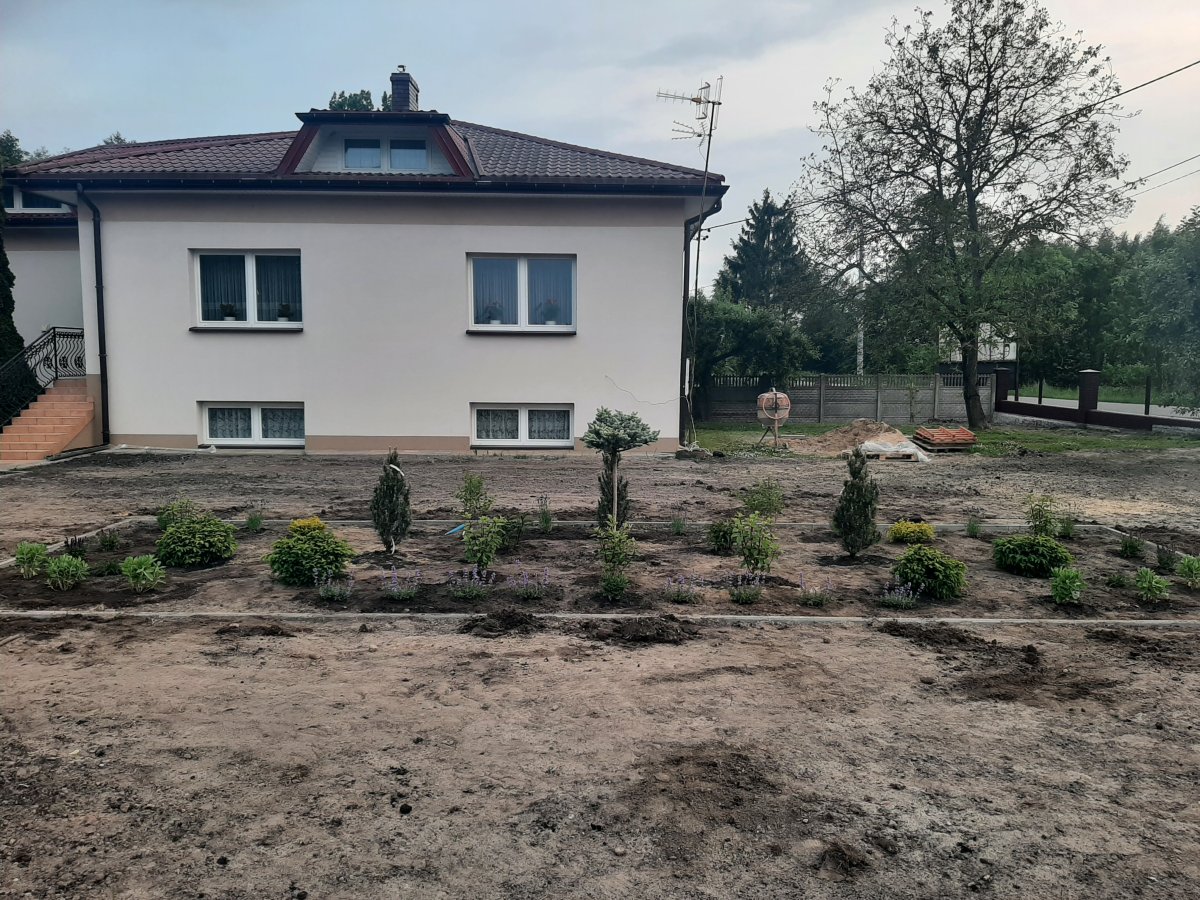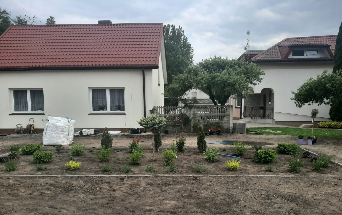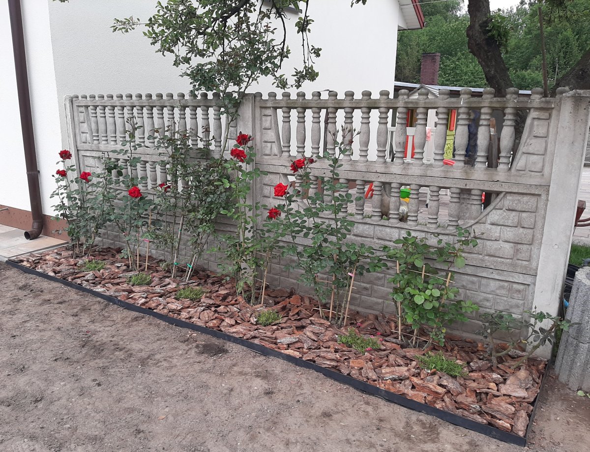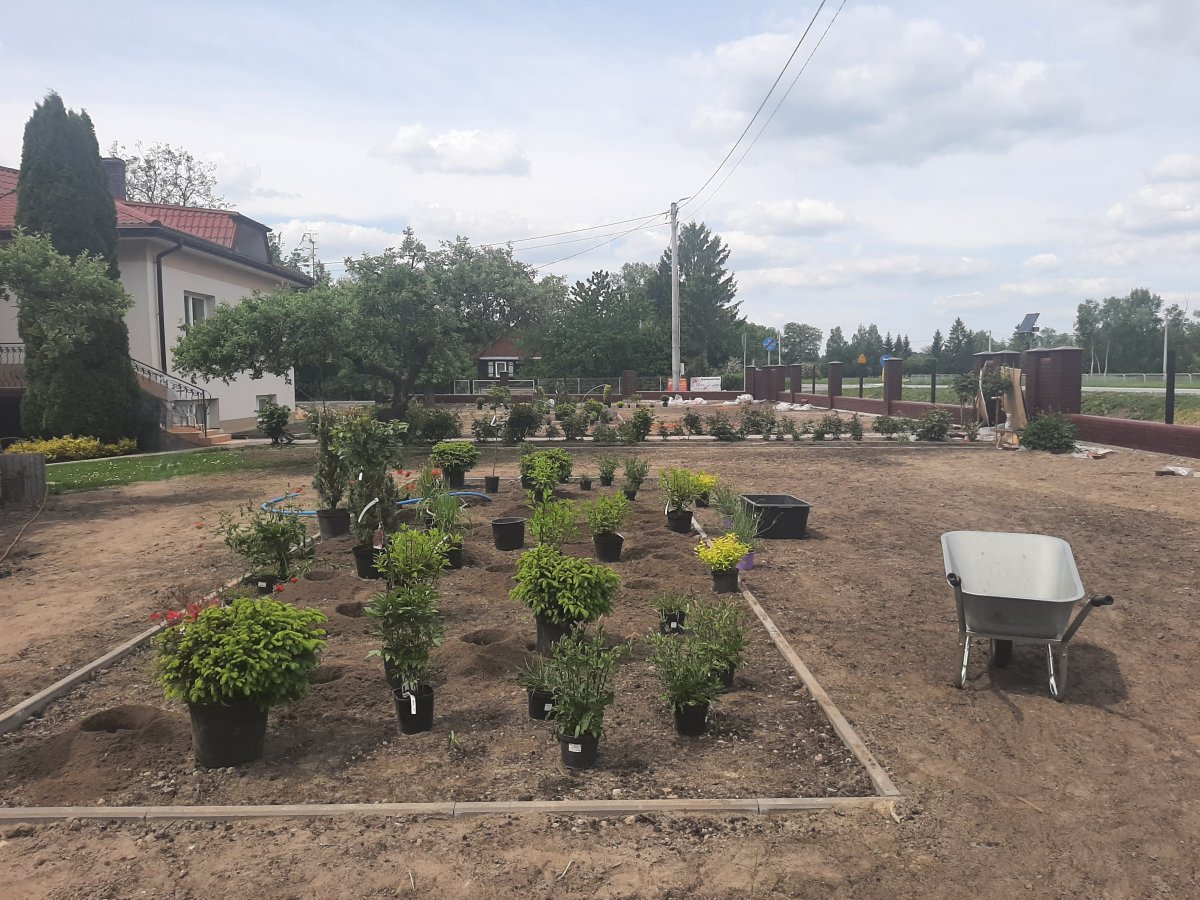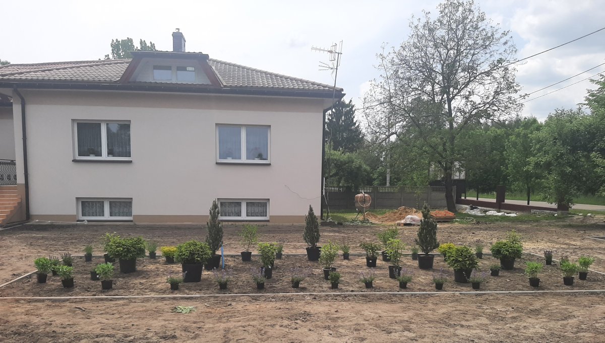 Z aleją różaną. W trakcie gdy my tworzyliśmy projekt Inwestorzy usunęli z działki stare tuje i zerwali darń celem założenia nowego trawnika. Pozostały tylko krzewy róż posadzone po obu stronach chodnika prowadzącego do domu. To właśnie one stały się punktem odniesienia dla reszty założeń. Realizacja maj-czerwiec.