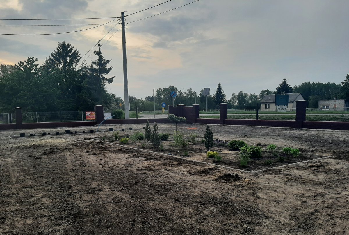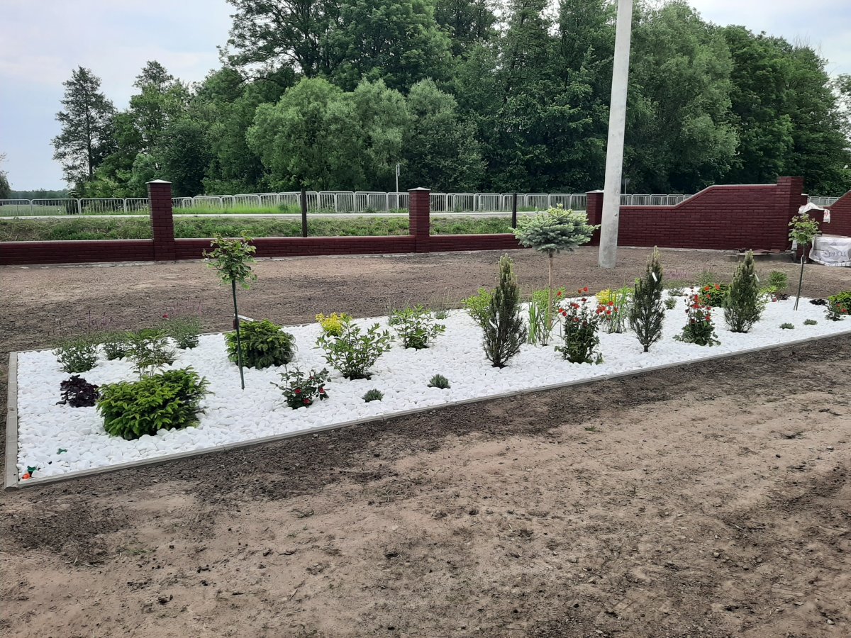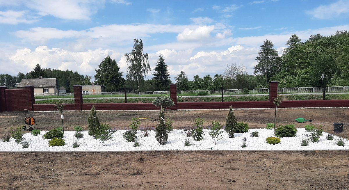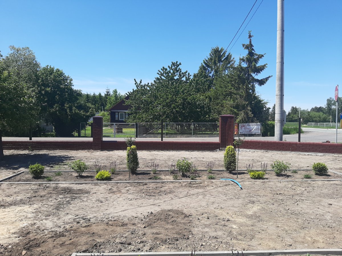 Z aleją różaną. W trakcie gdy my tworzyliśmy projekt Inwestorzy usunęli z działki stare tuje i zerwali darń celem założenia nowego trawnika. Pozostały tylko krzewy róż posadzone po obu stronach chodnika prowadzącego do domu. To właśnie one stały się punktem odniesienia dla reszty założeń. Realizacja maj-czerwiec.
