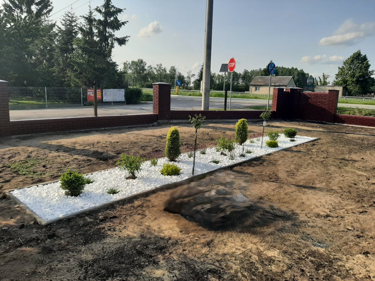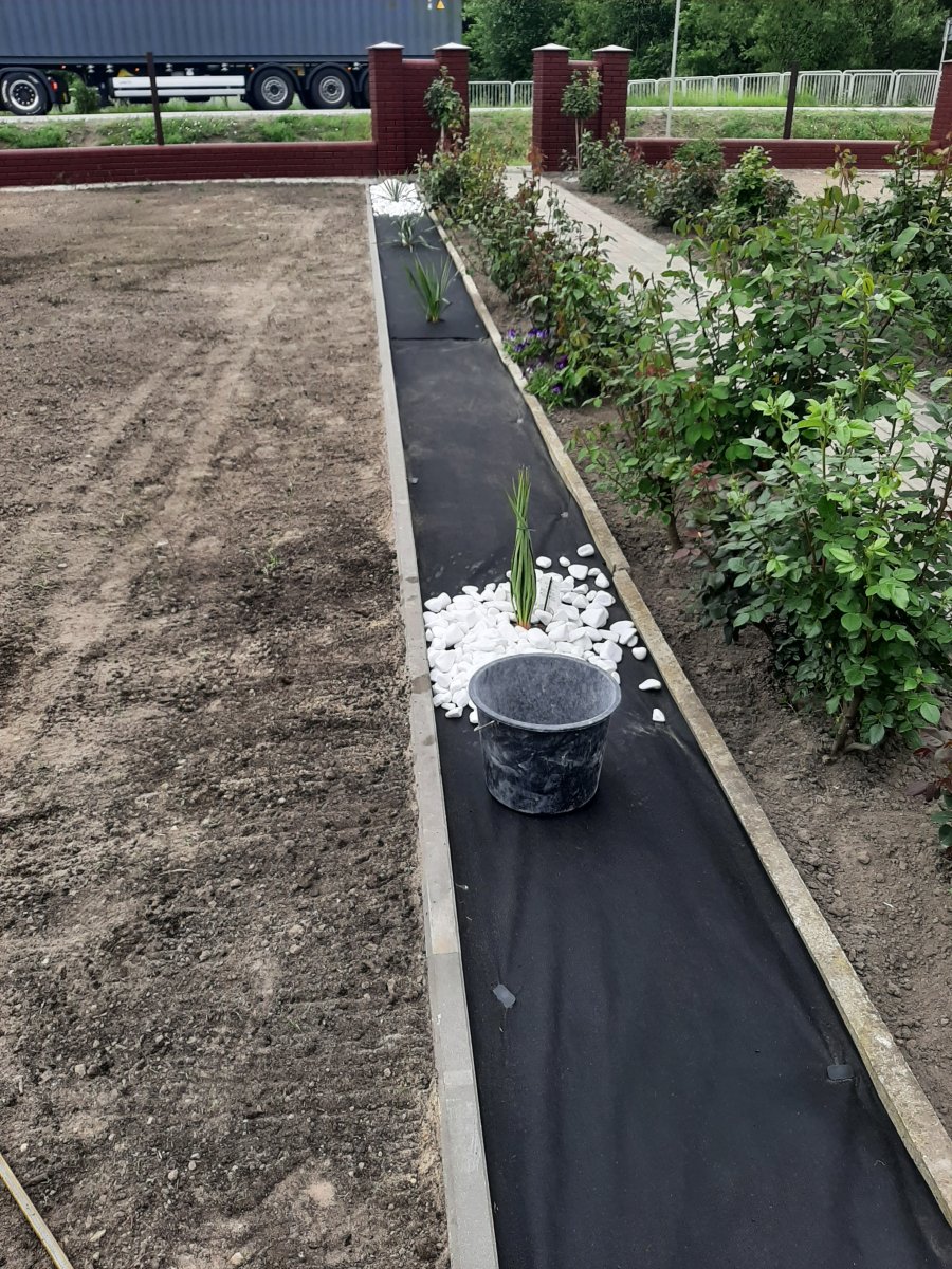 Z aleją różaną. W trakcie gdy my tworzyliśmy projekt Inwestorzy usunęli z działki stare tuje i zerwali darń celem założenia nowego trawnika. Pozostały tylko krzewy róż posadzone po obu stronach chodnika prowadzącego do domu. To właśnie one stały się punktem odniesienia dla reszty założeń. Realizacja maj-czerwiec.